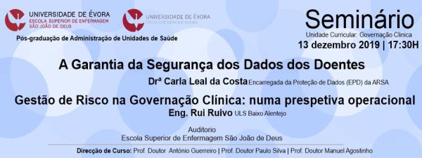 Vai realizar-se um seminário com os seguintes temas “ Garantia da proteção de dados do doente no sistema de saude: pela Drª Carla Leal da Costa da ARS Alentejo. O segundo tema “Gestão do Risco: uma perspetiva operacional será realizado pelo Engenheiro Rui Ruivo da ULS Baixo Alentejo.